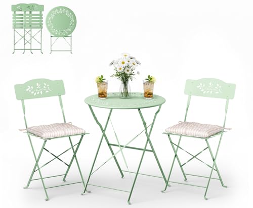 Bonnlo Bistroset 3-teilig aus Stahl mit Sitzkissen – Bistrotisch mit 2 Klappstühlen, Gartenmöbel Set, Durchbrochenes Olivenblatt-Design, Wetterbeständig, für Balkon, Garten & Wohnraum, Hellgrün