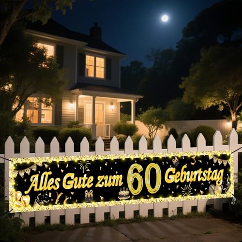 Seutgjie 60 Geburtstag Deko Geburtstagsbanner mit LED Lichtband für Frauen Männer 40 * 270CM Hintergrund Dekoration Gold Schwarz