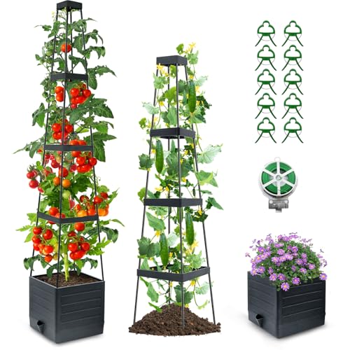 MQJIAZHI Erhöhte Pflanzkasten & Tomatenkäfig mit Rankgitter, selbstbewässernd, Tomatenstützen für kletternde Gemüsepflanzen – Geeignet für Terrassen, Gewächshäuser, Innen- & Außenbereich (2 Stück)