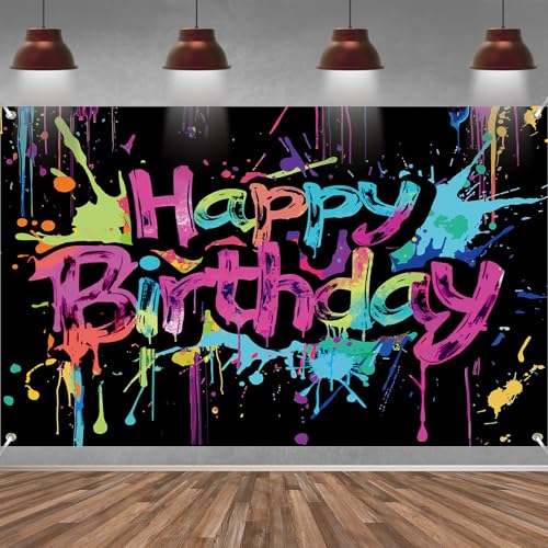 Neon Geburtstag Banner, Happy Birthday Banner Deko für Kinder, Extra Großes Geburtstag Party Hintergrund Banner für Mädchen und Jungen (Bunte Graffiti-Spritzerfarbe), 210x150 cm