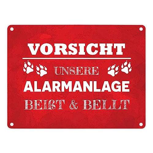 Vorsicht unsere Alarmanlage beißt & bellt Metallschild in 15x20 cm in Rot Dekoration lustiger Spruch Hund Haustier Warnung Einbrecher Hundefreund Geschenkidee