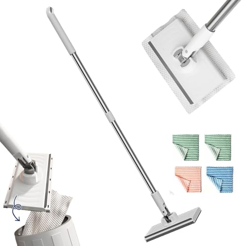 Wischmopp mit 4pcs Mop Pads, Bodenwischer Wischmop Set Automatische Demontage Bodenwischer mit Auswringfunktion 360 Grad Beweglicher Drehkopf Wischmop Nass- & Trockenmopps für Den Haushalt (D)