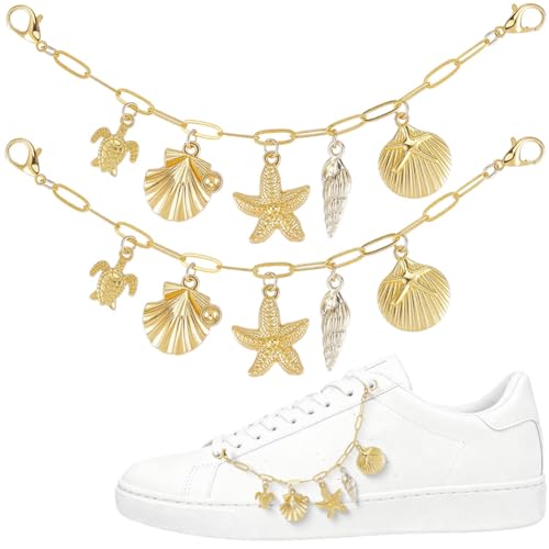 SOFPLATE 2 Stück Goldene Schuhkette Mit Anhänger Stiefelkette Accessoires Sommer Muschel Seestern Ozean Marine Messing Dekorative Ästhetik Hängender Metallschuhanhänger Verschluss Für Stiefel Sneaker
