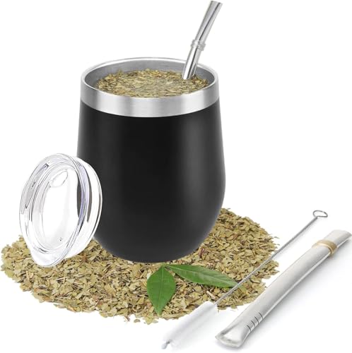 Zbozzba Mate Becher,Doppelwandige, hitzebeständige Mate-Teetasse aus Edelstahl mit BPA-freiem Deckel, Reinigungsbürste und zwei Strohhalmen, für Mate,Kaffee, Früchtetee (Schwarz,Eiförmig)