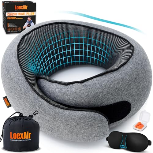 LOEXAIR™ Nackenkissen Flugzeug, Reisekissen für Flugzeug, Auto - 100% Baumwolle & Memory-Schaum Nackenhörnchen, Leicht & einfach mitzunehmen, komplettes Reiseset (Schlafmaske, Ohrstöpsel) - Hellgrau