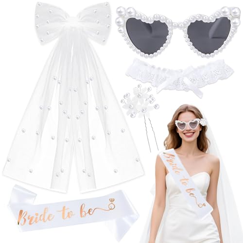 YeahBoom 5 Stück JGA Accessoires Frauen,Schleier JGA Weiße,Bride to Be Schärpe,Herz Sonnenbrille Perle,Braut Stirnband,Jga Frauen für Junggesellenabschied,Bachelorette Party und Hochzeitsfotografie