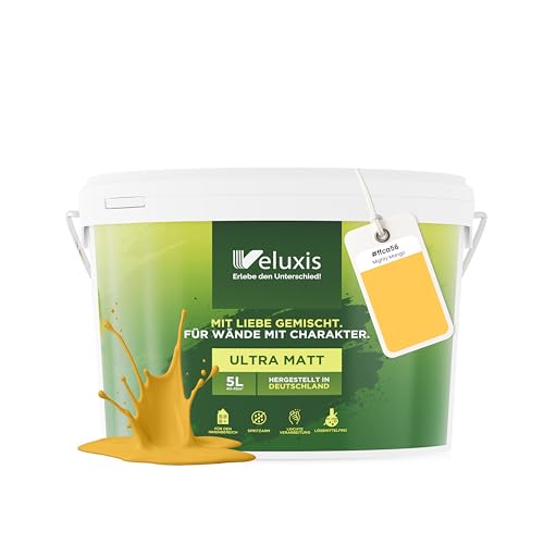 Veluxis® Wandfarbe Gelb für den Innenraum - 5 Liter & Deckkraft-Klasse 1, Streifenfrei, tropfarm & Öko Farbe, VOC-frei - (Mighty Mango)