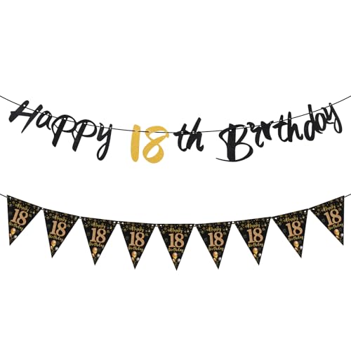 Deko 18 Geburtstag Banner,Schwarz Goldene Happy Birthday Girlande,Banner Wimpelkette Geburtstagsdeko,18 Geburtstag Party Dekoration für Jungen und Mädchen,Partyzubehörsets