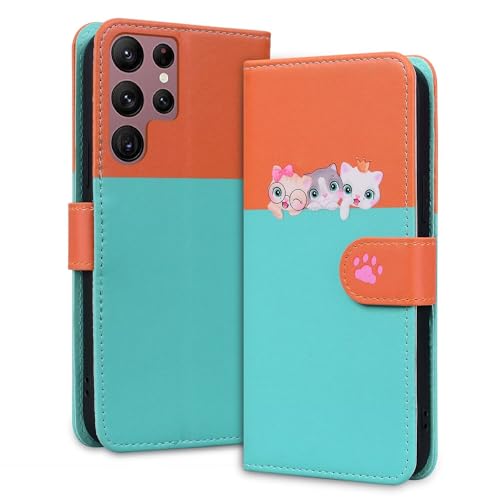 Rnrieyta Miagon für Samsung Galaxy S24 Ultra Hülle,Cartoon Hund Katze Handyhülle Gespleißt Brieftasche Klapphülle mit Kartenfach Ständer PU Leder Flip Case Cover Magnetverschluss,Blau