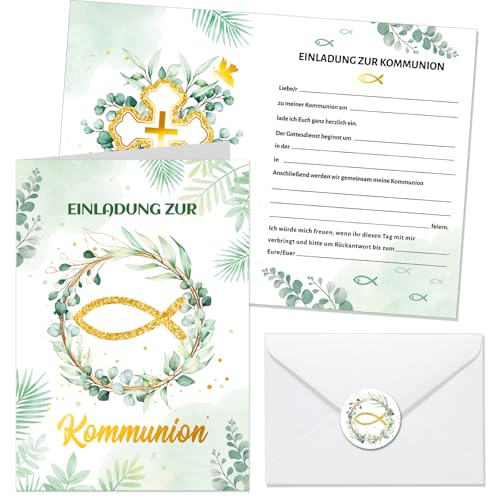 HOWAF 12 Einladungskarten Kommunion, Einladung Kommunion mit Umschlägen Aufkleber, Eucalyptus Fisch Einladungen Karte Erstkommunion Konfirmation Firmung Taufe für Jungen Mädchen, B