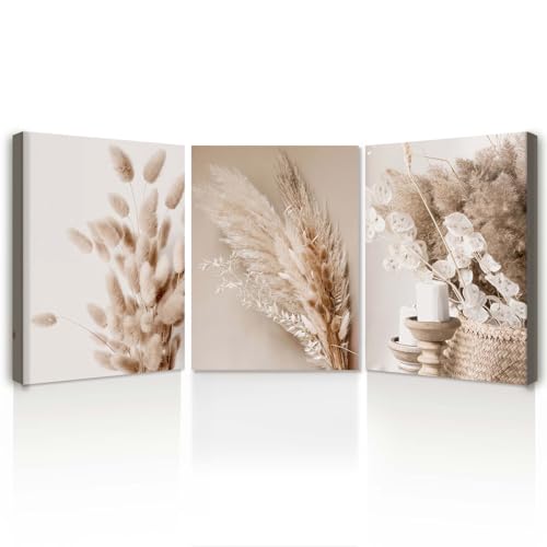 Galmcook Wandbilder Wohnzimmer 3er Set – Leinwand Bilder Beige Trockenblumen mit Rahmen, moderne Kunstdrucke 30x40 cm für Schlafzimmer, Flur oder Büro, Wanddeko mit Haken & spurlosen Nägeln