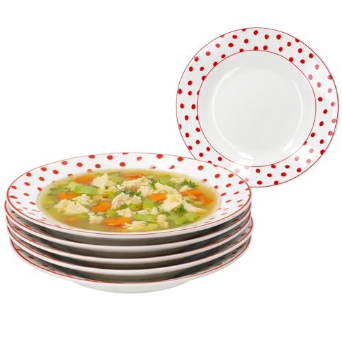 MamboCat 6er Set Suppenteller Rot gepunktet I 200ml, Ø20,5cm I tiefe Teller aus Steingut I weiß mit roten Punkten I Teller für Suppe, Pasta & Eintopf