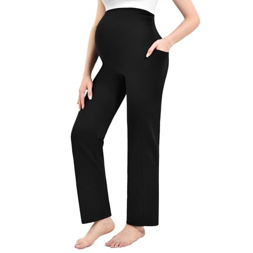 Walifrey Umstandshose Damen Weitem Bein mit Taschen, Schwangerschaft Umstandsmode Lässig Lose Gerade Bein Hosen Schwarz XL