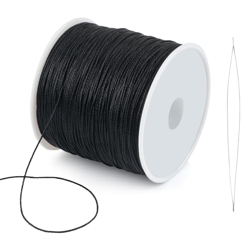 Gewachste Schnur, 0,5mm x 106m Gewachster Faden, Wachsschnur mit Perlennadel, Polyesterschnur Gewachstes Garn für Armbänder, Halsketten, Schmuckherstellung, DIY Basteln (Schwarz)