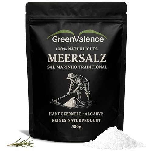GreenValence Sal Marinho Tradicional – 100% Natürliches grobes Meersalz aus der Algarve, Handgeerntet, Unraffiniert, Reich an Mineralien, Ohne Zusätze, Premium Gourmet Salz für Küche & Grill (500g)