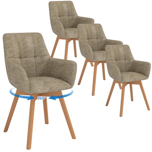 LEWE Esszimmerstühle Drehbar 4er Set mit Armlehne und Holzbeinen, 360°Drehstuhl, Polsterstuhl mit Ergonomische Stoffrückenlehne, für Esszimmer, Küche, Wohnzimmer, Schlafzimmer, Braun