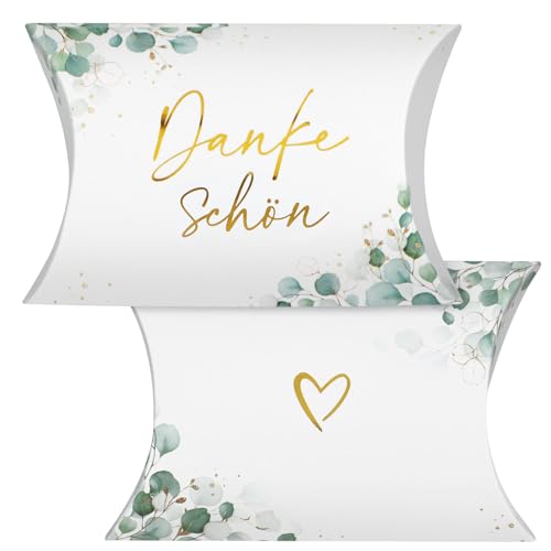 BETESSIN Gastgeschenke Hochzeit - 50 Stück Dankeschön Kissenschachteln mit Eukalyptus Design - Dankeschön Geschenke Klein - Geschenkboxen für Hochzeit, Geburtstag, Taufe, Babyparty uvm. (10x7x2.4cm)
